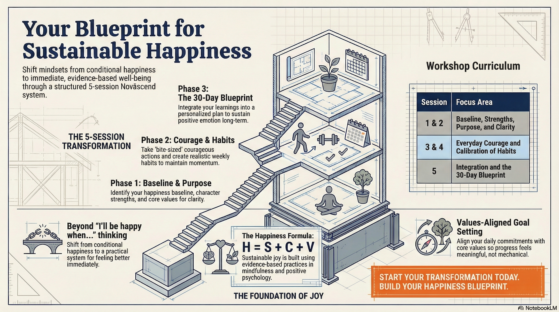 The Happiness Blueprint is a 5âsession live course that turns âIâll be happy whenâŚâ thinking into a practical system for feeling happier nowâhelping you understand what truly drives your happiness, align your goals with your deepest values, and build weekly habits so you feel more grounded and onâpurpose long after the program ends.
