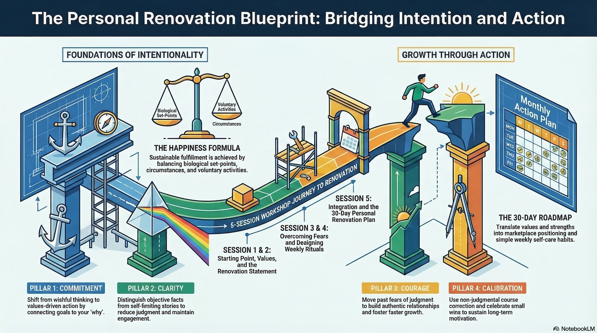 The Personal Renovation Blueprint is a 5âsession live course that helps you renovate your professional life without ignoring the rest of youâusing the NovÄscend System to clarify who youâre becoming, reframe discouraging stories, and design a 30â90 day roadmap of practical actions, supports, and habits so you can move into work that feels more aligned, resilient, and genuinely yours.